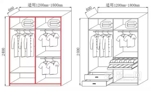 一般需要將衣柜左右兩邊分別設置成男女方各自的儲衣空間。